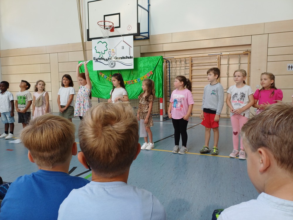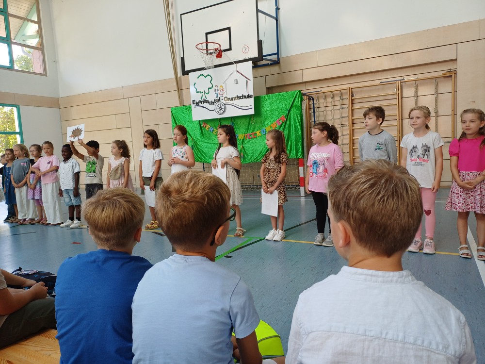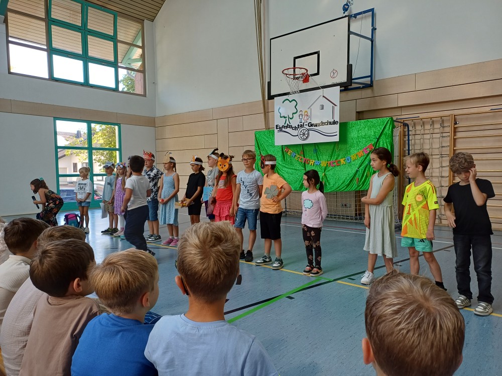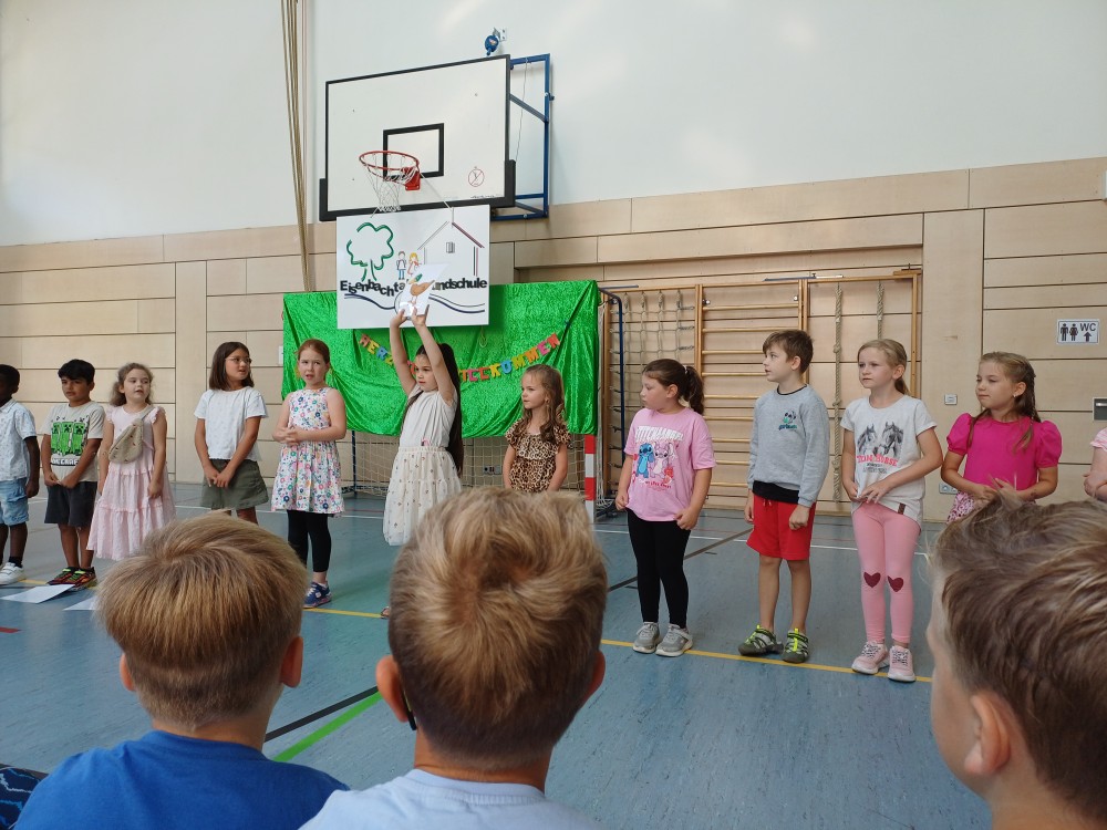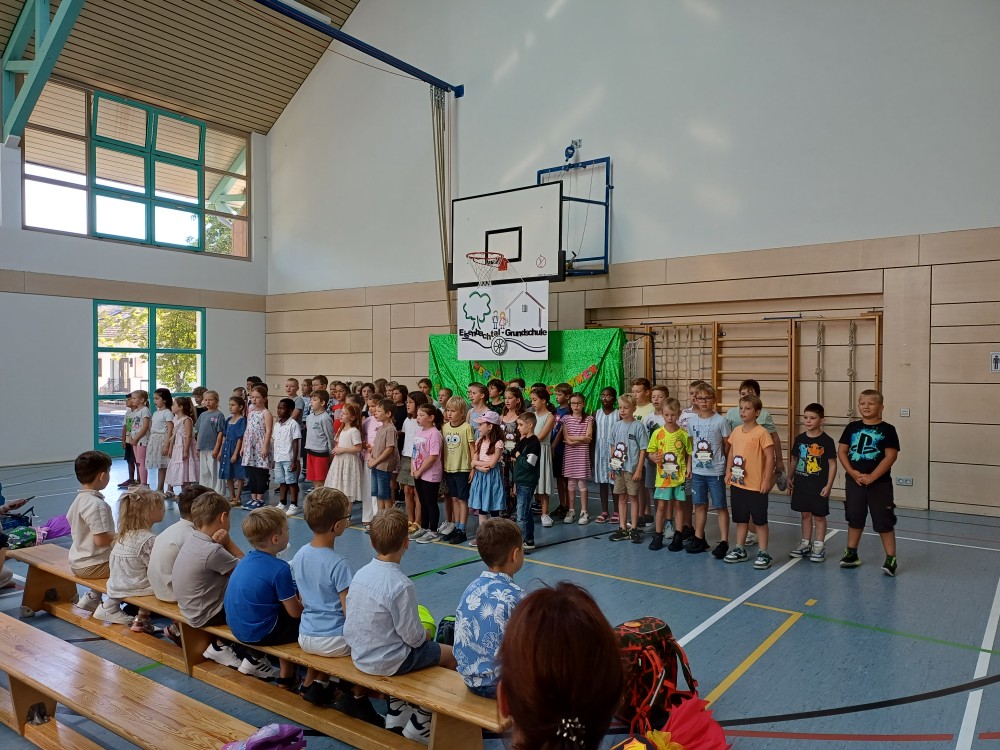 Am 19.08.2025 fand die Aufnahmefeier für unsere Erstklässler statt. Nach einem Gottesdienst in der Kirche erwartete die Erstklässler, deren Eltern und Großeltern sowie alle anwesenden Gäste ein buntes Programm in der Halle, mit dem die Schulneulinge herzlich an unserer Schule begrüßt wurden. Die Kinder der Klasse 2 sangen das Lied „Keiner muss hier alles können“ und trugen ein passendes Sprechstück vor. Die Schülerinnen der Klasse 3 präsentierten das Spielstück „Von den beiden Erstklasskindern“ und flöteten das Stück „Für Elise“ vor. Die Kinder der Klasse 4 hatten ein Gedicht sowie gute Wünsche für die Erstklässler parat, außerdem sangen die Kinder das Lied „Du, ich, wir“. Zum Abschluss des Programms sangen alle Kinder der Klassen 2 bis 4 gemeinsam unseren Schulsong. Der Förderverein unserer Schule überreichte Spielsachen für die Pausenboxen sowie ein Buchpaket für unsere Schülerbücherei. Die Kinder hatten vor den Ferien Buch-Wünsche geäußert, auf dieser Grundlage wurden die neuen Bücher bestellt. Ein großes Dankeschön an den Förderverein für diese tolle Unterstützung. Im Anschluss an die Beiträge wurden die Kinder der Klasse 1 sowie ihre Paten aus Klasse 3 nach vorne gerufen. Nach dem Programm begleiteten die Paten die Erstklässler in die Klasse. Die Eltern sowie die Großeltern der Erstklässler hatten Zeit, das Elterncafé zu besuchen. Vielen Dank an alle Helfer und Helferinnen, die uns bei der Organisation sowie bei der Durchführung des Elterncafés geholfen und unterstützt haben. Vielen Dank auch an die Eltern, die einen Kuchen gespendet haben. Der Erlös des Elterncafés kommt dem Förderverein zu Gute.
