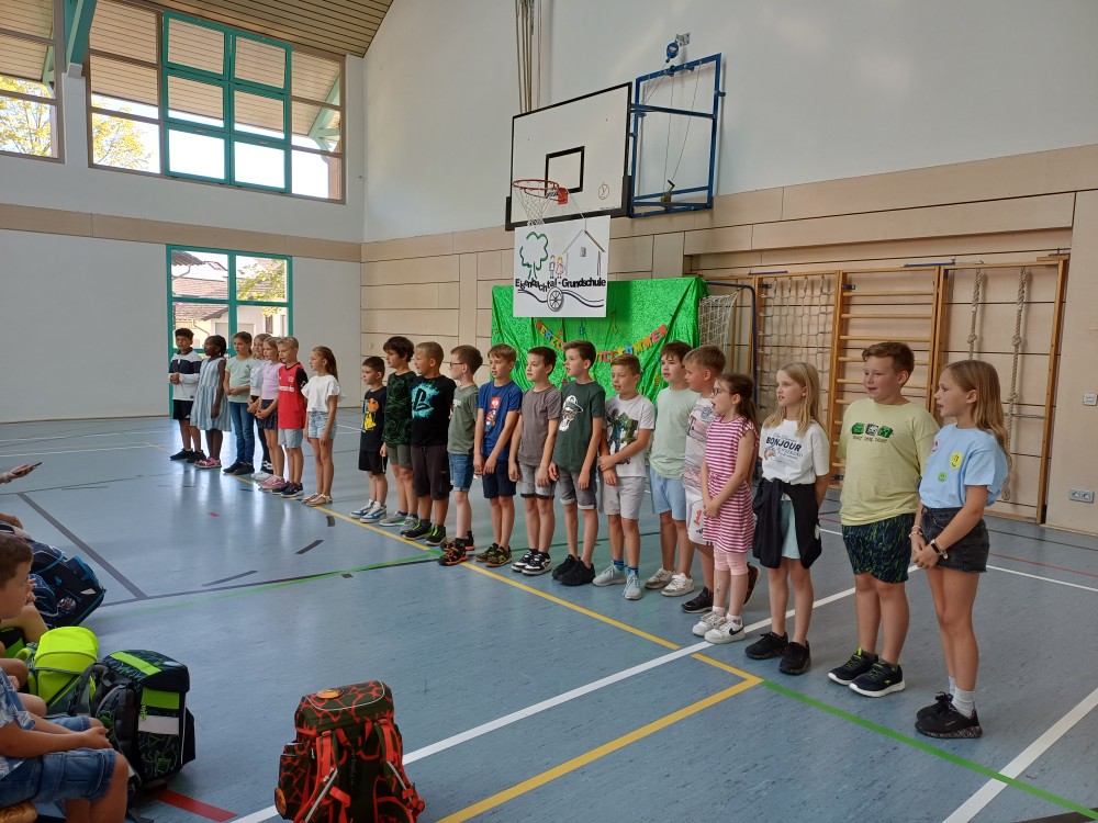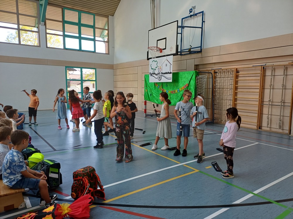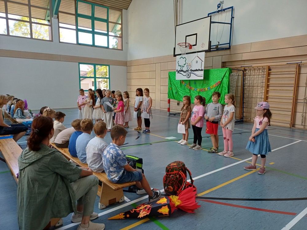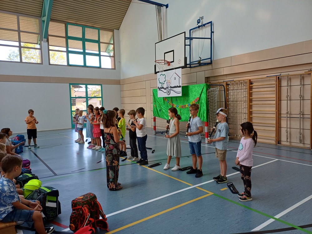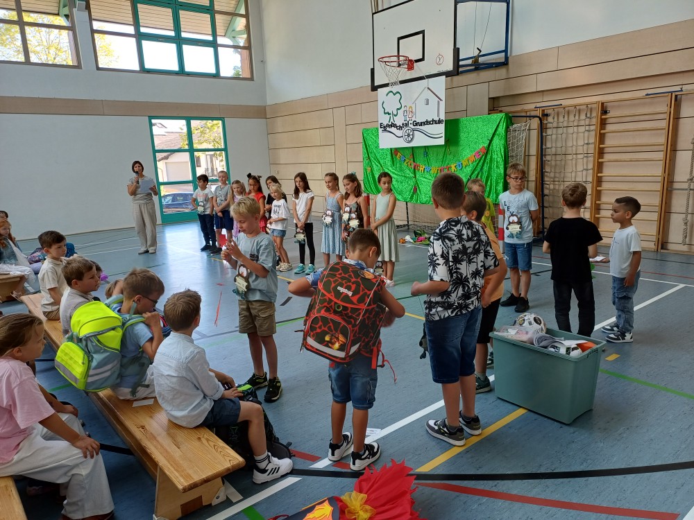 Am 19.08.2025 fand die Aufnahmefeier für unsere Erstklässler statt. Nach einem Gottesdienst in der Kirche erwartete die Erstklässler, deren Eltern und Großeltern sowie alle anwesenden Gäste ein buntes Programm in der Halle, mit dem die Schulneulinge herzlich an unserer Schule begrüßt wurden. Die Kinder der Klasse 2 sangen das Lied „Keiner muss hier alles können“ und trugen ein passendes Sprechstück vor. Die Schülerinnen der Klasse 3 präsentierten das Spielstück „Von den beiden Erstklasskindern“ und flöteten das Stück „Für Elise“ vor. Die Kinder der Klasse 4 hatten ein Gedicht sowie gute Wünsche für die Erstklässler parat, außerdem sangen die Kinder das Lied „Du, ich, wir“. Zum Abschluss des Programms sangen alle Kinder der Klassen 2 bis 4 gemeinsam unseren Schulsong. Der Förderverein unserer Schule überreichte Spielsachen für die Pausenboxen sowie ein Buchpaket für unsere Schülerbücherei. Die Kinder hatten vor den Ferien Buch-Wünsche geäußert, auf dieser Grundlage wurden die neuen Bücher bestellt. Ein großes Dankeschön an den Förderverein für diese tolle Unterstützung. Im Anschluss an die Beiträge wurden die Kinder der Klasse 1 sowie ihre Paten aus Klasse 3 nach vorne gerufen. Nach dem Programm begleiteten die Paten die Erstklässler in die Klasse. Die Eltern sowie die Großeltern der Erstklässler hatten Zeit, das Elterncafé zu besuchen. Vielen Dank an alle Helfer und Helferinnen, die uns bei der Organisation sowie bei der Durchführung des Elterncafés geholfen und unterstützt haben. Vielen Dank auch an die Eltern, die einen Kuchen gespendet haben. Der Erlös des Elterncafés kommt dem Förderverein zu Gute.