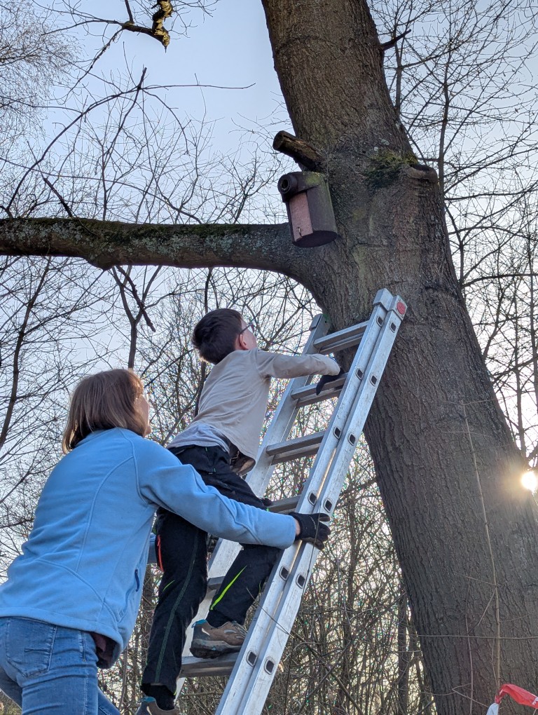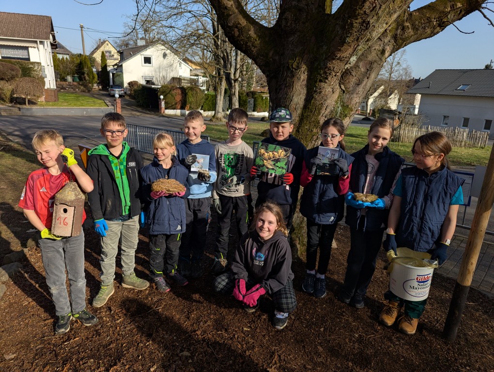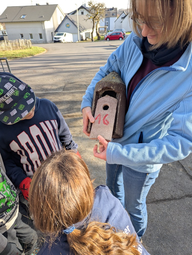 Am 26.02.2026 säuberten die Natur-Ranger mit den Lehrerinnen Frau Kapp und Frau Schweitzer 16 Nistkästen. Von den 16 Nistkästen waren 13 Kästen hauptsächlich von Meisen besetzt. Außerdem fanden die Kinder ein Wespennest. Während der Aktion nahmen alle Beteiligten den nahenden Frühling mit unterschiedlichen Sinnen wahr: Hören, Riechen und Sehen.